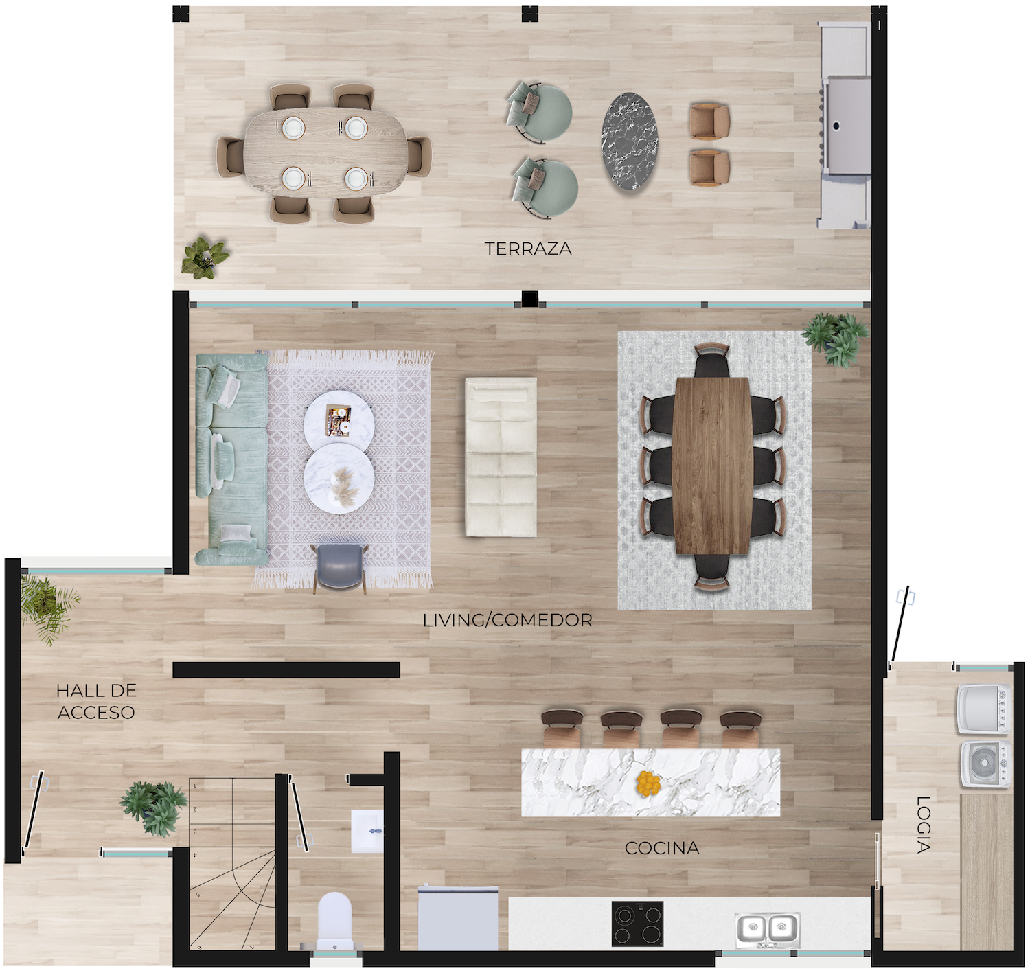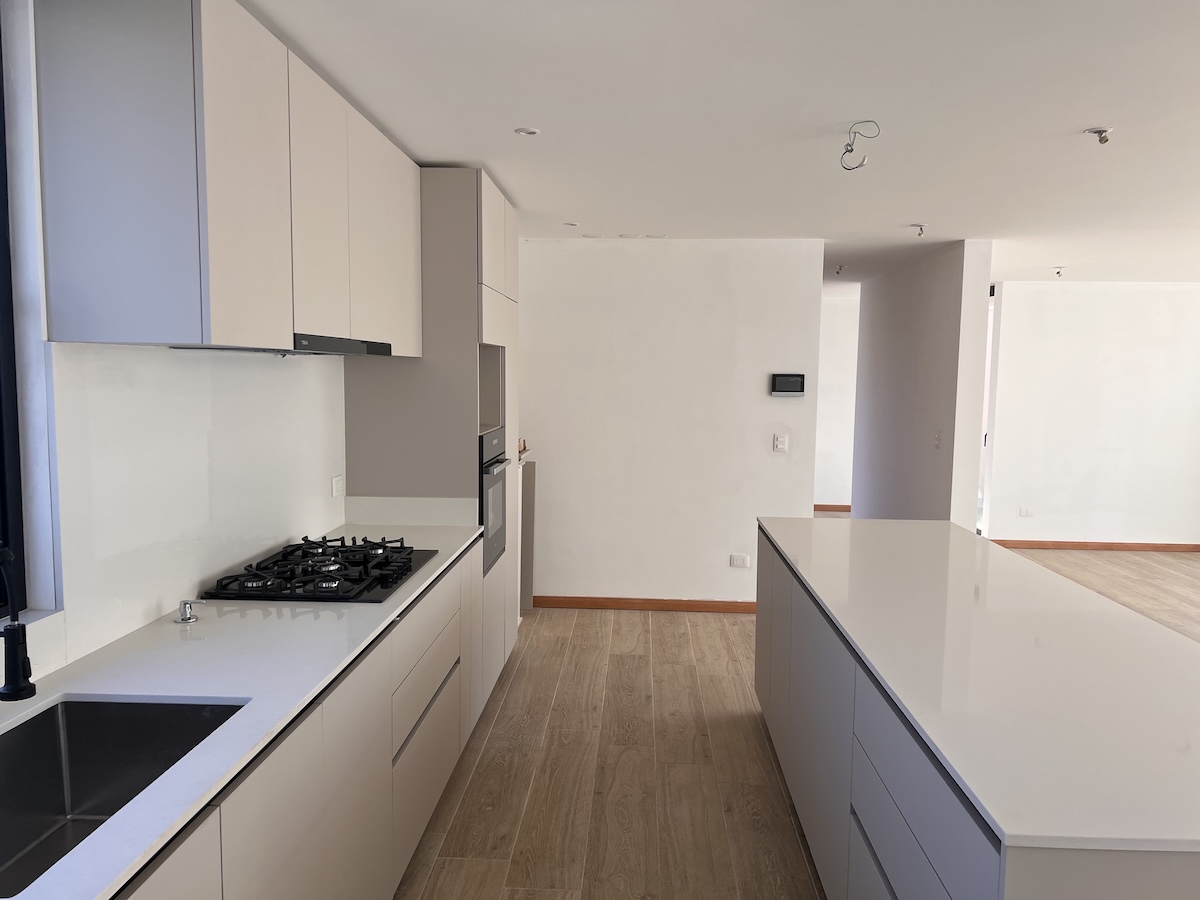 Cubierta de mármol reconstituido, estructura de melamina y paneles frontales acrílicos marca HBT. Isla amplia con gabinetes.